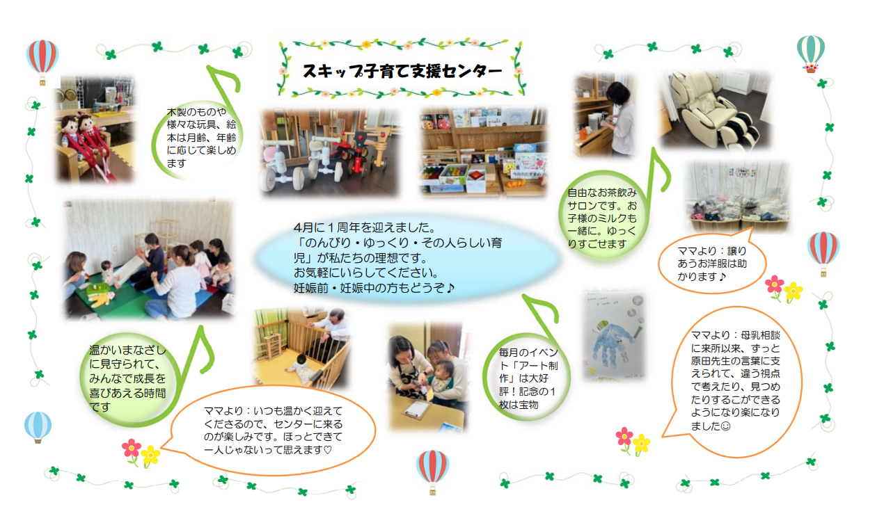 この度、スキップ子育て支援センター開設1周年を記念して、「君津市子育て通信5月号」に紹介していただきました。毎月イベントも開催しておりますので、お気軽にいらしてください。 妊娠前・妊娠中の方もどうぞ♪