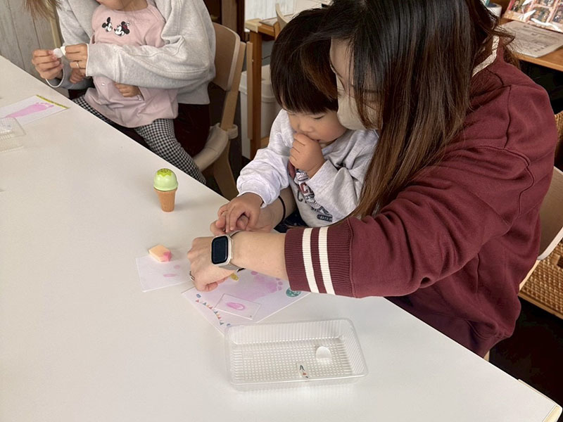 2つのイースターエッグシールとお花シールで装飾し、もうすぐ完成です! シールをぺたっと貼ったり、うさぎさんの耳をぽんぽんしたりと、率先して行っている子がいました♪